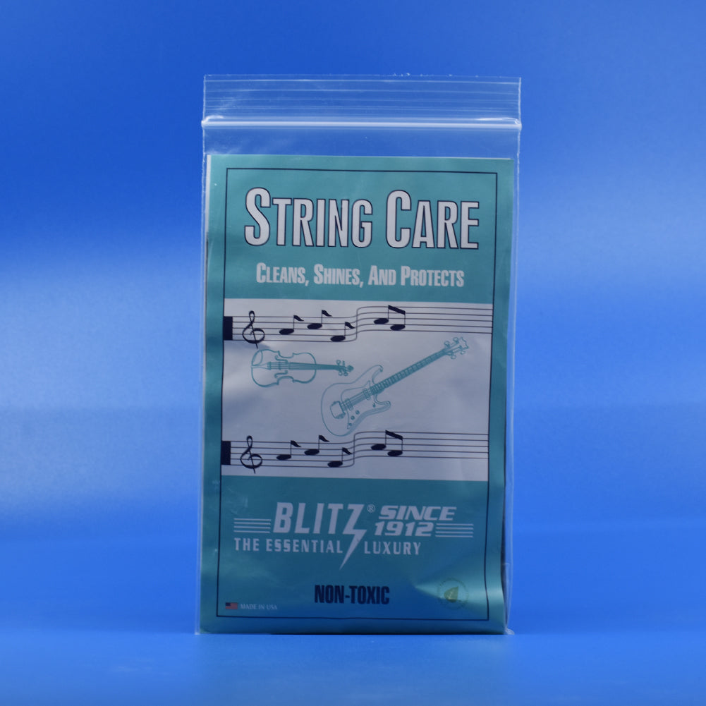 Specially treated String Care cleaning cloth removes dirt and tarnish with little effort. String Care can be used on all metal strings for both acoustic and electric instruments. It leaves a protective shield on strings. Easy to use! Wipe strings gently with the String Care cleaning cloth. The yellow cloth will darken with use, but will continue to be an effective cleaner. Polish with the gray cloth, leaving as much of the protective shield as is desired to make the strings slick.